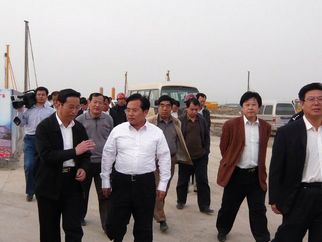 2008年4月14日,濰坊市委書記張新起視察集團公司施工中的奧體中心工程。集團公司總經理朱九洲(左上圖左三)陪同張書記視察 |