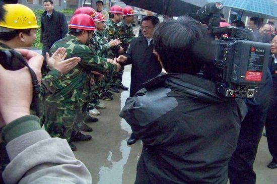 4月13日下午,春雨綿綿,中共中央政治局常委、中央紀律檢查委員會書記賀國強在有關人員陪同下,冒雨視察了北川新縣城援建工作。在集團公司援建的溫泉一期安居房工程現場,賀國強走進住宅樓實地察看已經建好的新居,非常高興,對山東省濰坊市援建的安居房工程給予很高的評價,贊揚山東省濰坊市的援建隊伍是一支能打硬仗的施工隊伍,他感謝在援建工作中作出辛苦努力的所有援建人員,并預祝圓滿完成援建任務。