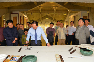 開幕式之后,與會領(lǐng)導(dǎo)、嘉賓和會員參觀了設(shè)在“昌大美術(shù)館“的劉良峰個展作品,書法家們還現(xiàn)場潑墨題字獻寶。另外,上午活動之余,與會人員還參觀了“泰和上筑”樓盤。