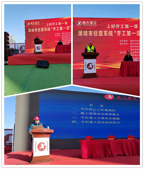 2023年2月15日上午,濰坊市住建系統“開工第一課”啟動活動暨安全教育培訓會議在集團八建公司高創·水緣灣項目現場舉行。濰坊市住建局黨組書記、局長鐘光文,濰坊市建筑業發展服務中心主任許增賢,高新區住建局局長牟軍生等出席活動。集團公司總裁朱九洲,副總裁楊成國出席并全程參與活動。各縣市區住建局主要負責人、分管負責人,相關業務科室負責人;房地產開發企業、建筑施工企業、 監理企業分管安全負責人,集團安全生產部、各基層公司安全總監、安全生產部全體人員共約200余人參會。
