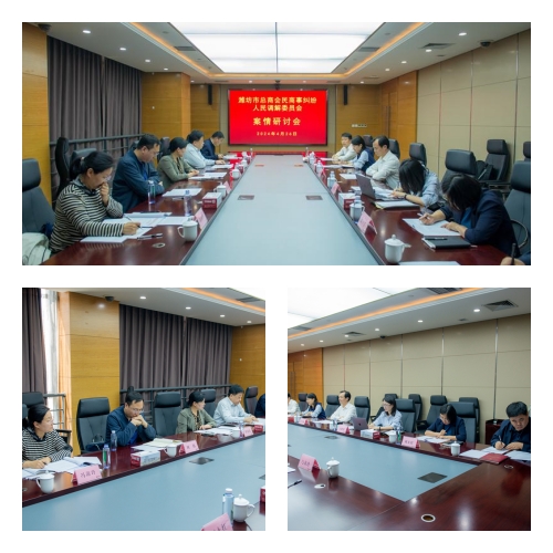 2024年4月26日上午,濰坊市總商會民商事糾紛人民調解委員會案情研究會在集團二樓視頻會議室召開,集團總裁朱九洲作為調解委員會副主任出席會議。出席會議的領導和專家還有濰坊市工商聯黨組成員、副主席、調解委員會主任譚述霞、濰坊市中級人民法院民一庭副庭長馮海玲、濰坊市中級人民法院立案一庭二級法官柴象坤、濰坊市中級人民法院研究室主任周偉、山東豪德律師事務所主任付興剛、山東豪德律師事務所合伙人、訴訟中心主任王曉倩、濰坊市稅務局一級行政執法員鄭春偉、濰坊市自然資源和規劃局開發利用科一級主任科員劉永紅、濰坊市工商聯經濟咨詢科副科長齊鳳濤。