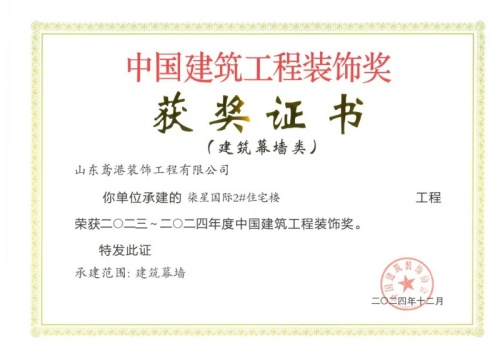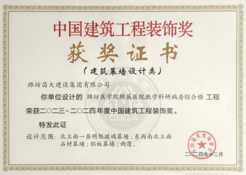 2024年12月10日,中國建筑裝飾協會在北京召開大會,表彰2023~2024年度“中國建筑工程裝飾獎”工程。集團裝飾幕墻工程公司、山東鳶港裝飾工程有限公司的三項工程榮獲五個獎項:濰坊醫學院附屬醫院教學科研病房綜合樓(建筑幕墻類和幕墻設計類)、濰坊市婦女兒童健康中心病房樓(公共建筑裝飾類和公共建筑裝飾設計類),柒星國際2#住宅樓(建筑幕墻類)。